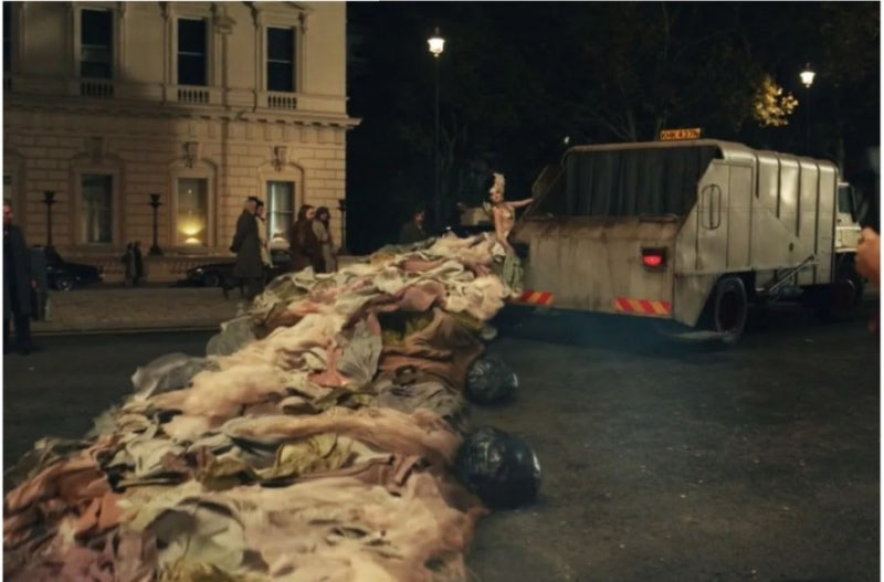 이 영화의 하이라이트는 크루엘라로 '흑화' 이후 후미에 크루엘라가 남작 부인의 공식 행사에 예고 없이 나타나 그녀의 권위에 도전하는 일련의 '패션 게릴라 퍼포먼스' 장면들입니다. 그중에서도 단연 압권은 남작 부인의 성대한 파티장 앞에 쓰레기 수거차를 몰고 나타나, 수십 미터에 달하는 화려한 드레스를 펼치며 쓰레기 더미 위에서 당당히 포즈를 취하는 장면입니다. 남작 부인이 고수해 온 우아함과 격식을 비웃듯, 크루엘라는 '쓰레기'라는 파격적인 소재를 예술로 승화시키며 대중의 시선을 단숨에 사로잡습니다.